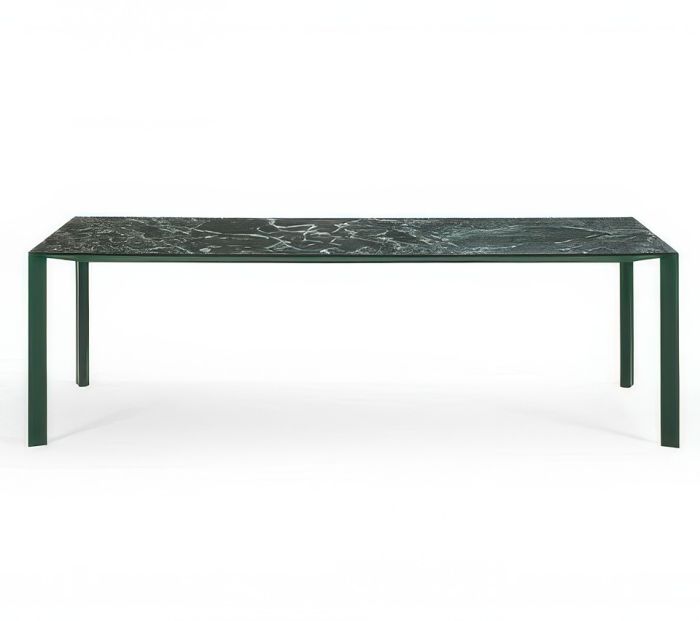 Akashi is a fixed table with a four-leg base and lacquered metal legs and structure. The fixed version offers a top in veneered wood, Fenix, laminate, ceramic, MDF, or glass (140x140 size not available in crystalceramic). When configured with a ceramic or glass top, Akashi is suitable for outdoor use. An extendable version is also available.