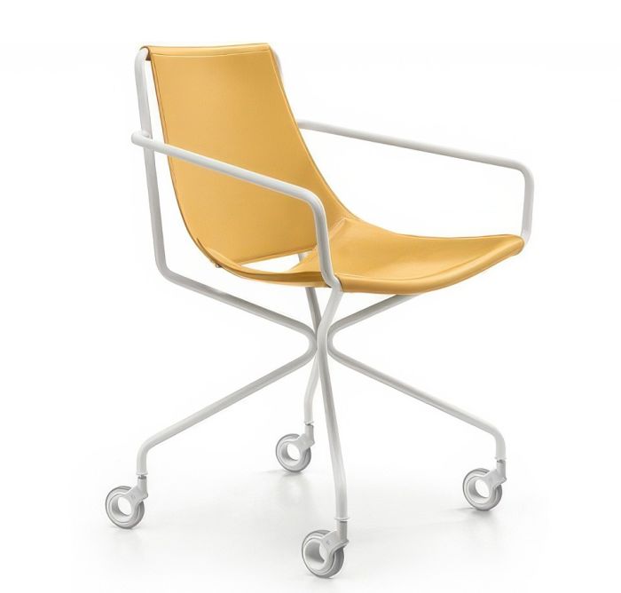 The Apelle armchair features a four-leg base in lacquered metal, with a seat and backrest made from hide or Tuscan hide.