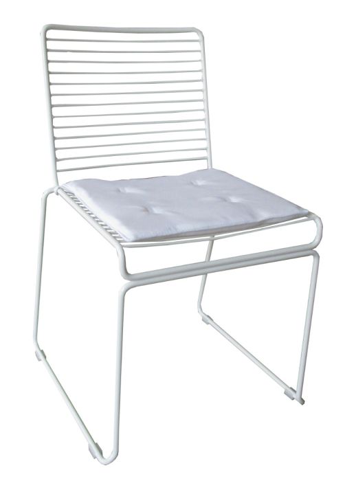 The Arrow Straight Chair is fashioned from fine-grade steel coated in white. It features a grill-inspired seat and back. Cushions are available to enhance comfort in hotels and restaurants. Rubber stoppers are attached on the feet.