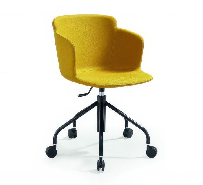 Features a five-way lacquered metal base on wheels and a seat upholstered in leather, faux leather, or fabric.