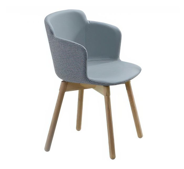 Calla armchair featuring a four-legged wooden base. Seat available upholstered in fabric, leather, or imitation leather.