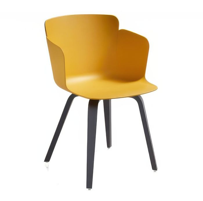 Calla armchair featuring a four-legged wooden base and a polypropylene seat. Optional cushions available in fabric, leather, or faux leather.