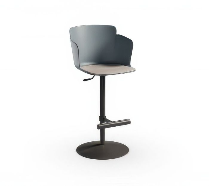Calla swivel stool with armrests, height-adjustable features, a metal base, and a polypropylene seat. The seat is upholstered in fabric, faux leather, or leather.