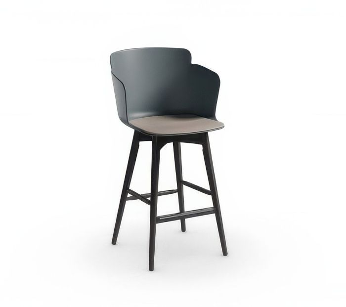 Fixed Calla stool with armrests, featuring a lacquered ash wood base and a polypropylene seat upholstered in fabric, leather, or faux leather. Also available in the H75 version.