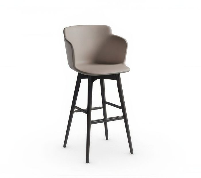 Fixed Calla stool with armrests, featuring a lacquered ash wood base and seating upholstered in fabric, leather, or faux leather. Also available in the H65 version.