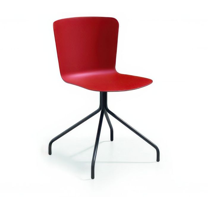 Calla chair with a fixed four-way trestle base in lacquered metal and a polypropylene seat, suitable for outdoor use. Optional: a fixed cushion for the seat upholstered in leather, faux leather, or fabric. This chair is also available with armrests and in an upholstered version, both with and without armrests.