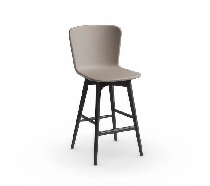 Fixed Calla stool with a lacquered ash wood base and upholstered seating in fabric, leather, or faux leather. Available in the H75 version as well.