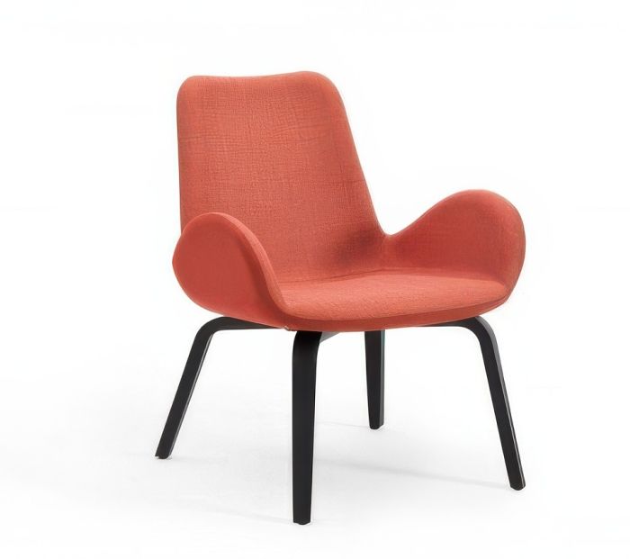 Dalia lounge chair with a low backrest and a sled base in lacquered wood. The shell is upholstered in your choice of leather, faux leather, or fabric.