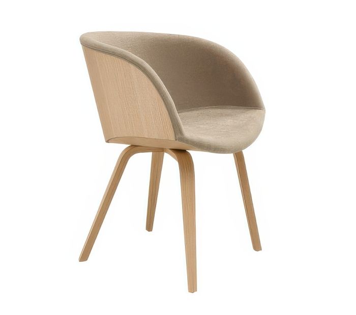 Danny armchair with a wooden base and a shell upholstered in leather, faux leather, or fabric. A wooden back face, matching the base finish, is also available.