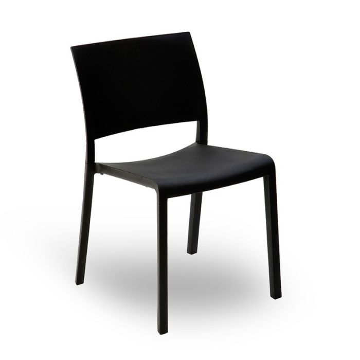 Chair suitable for indoor and outdoor use, constructed from fiberglass and polypropylene through injection molding. This chair is stackable and includes UV protection. An optional feature is a clamp connection for linking multiple chairs, ideal for conventions and events, made from injected translucent polycarbonate.