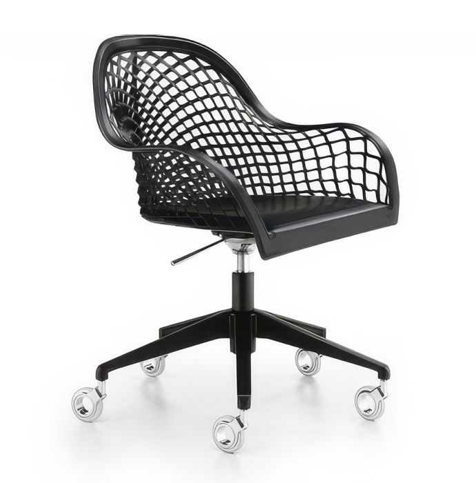 The Guapa DPB is a swivel, height-adjustable armchair with a low backrest and a five-star base in lacquered metal. It features an integrated tilt mechanism and is available with white wheels paired with a white base, or chrome wheels with a black edge paired with a black base. The seat and backrest are crafted from hide.