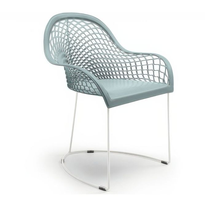 The Guapa collection includes a chair, armchair, lounge chair, rocking chair, and stool. Complementing the collection are coffee tables, a lamp, and a coat rack, all distinguished by their unique mesh hide construction.