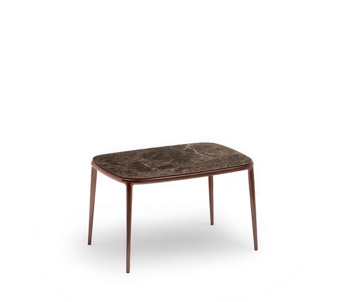 Lea coffee table with a four-legged lacquered metal base, featuring a top in wood or ceramic.