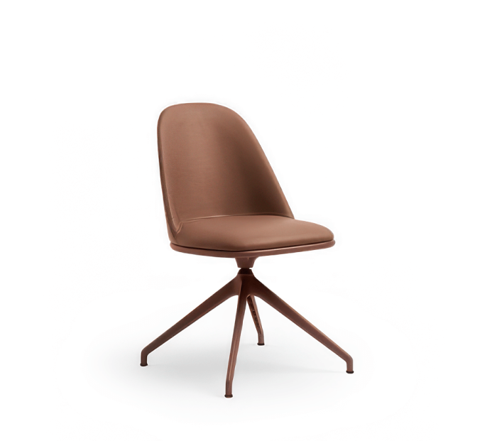 Lea chair with a fixed metal trestle base featuring a self-return mechanism. The seat is upholstered in leather, faux leather, or fabric.