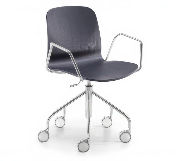 Liù office chair with armrests, mounted on wheels, featuring swivel and height-adjustable capabilities. It has a five-way metal base and a wooden shell.
