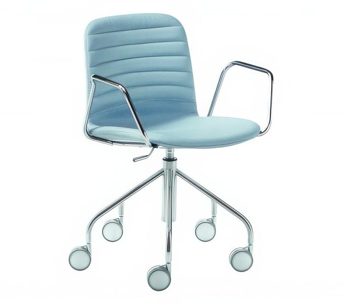 Liù office chair with armrests, featuring a five-way base, swivel, and height adjustability. The shell is upholstered in leather, faux leather, or fabric.