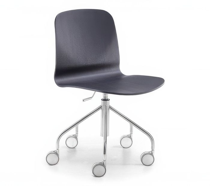 Liù operative office chair with wheels, offering swivel and height-adjustable features. It has a five-way metal base and a wooden shell.