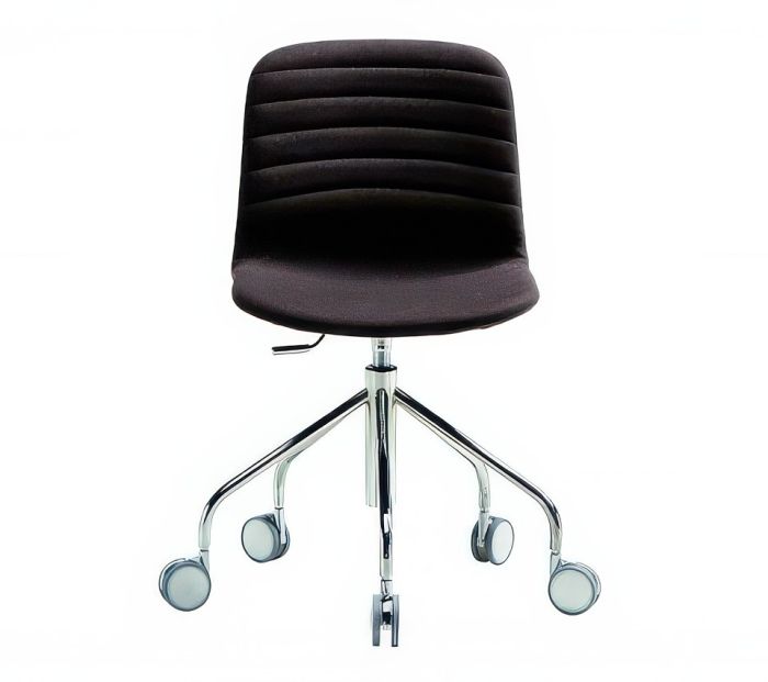 Liù office chair with a five-way base on wheels, featuring swivel and height-adjustable capabilities. The shell is upholstered in fabric, faux leather, and leather.