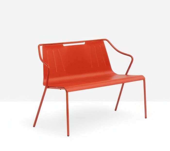 Ola two-seater bench with a lacquered metal frame. Suitable for outdoor use and stackable up to four units.