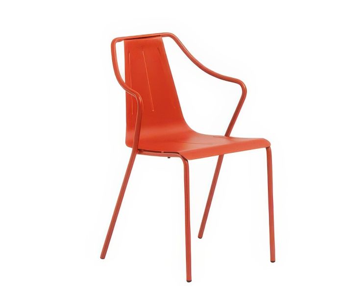 Ola armchair, featuring a lacquered metal frame and shell, is suitable for outdoor use in its stainless steel version. It is stackable, accommodating up to four units.