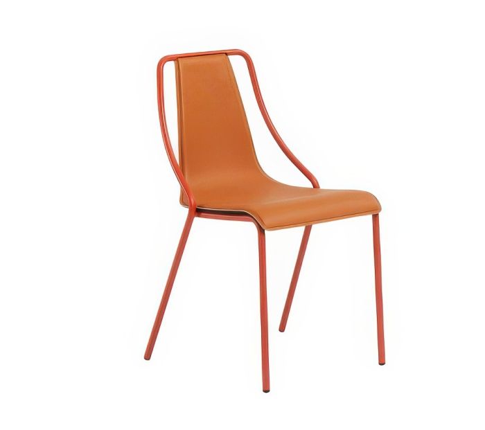 Ola chair with a lacquered metal structure and a shell upholstered in hide or Tuscan hide. The Ola chair is stackable up to four units and holds the CATAS certification.