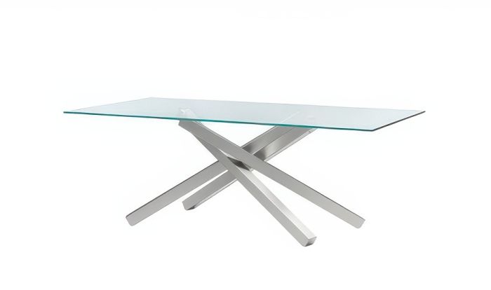 Pechino fixed table with metal base. Top available in glass, veneered wood, or solid wood. Transparent glass top available only in 200x106 size.