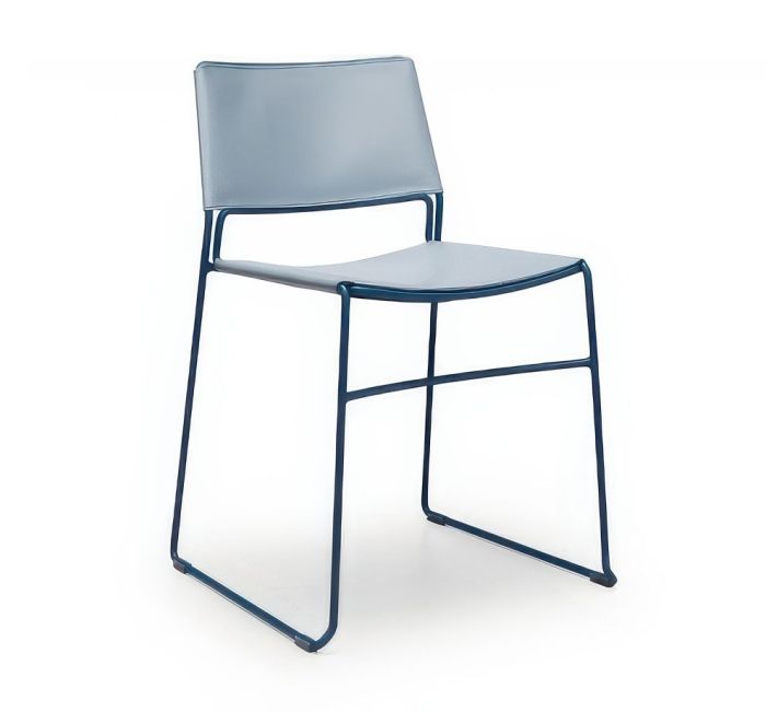 Slim chair with a metal sled base featuring a seat and backrest in hide or Tuscan hide. Stackable up to four pieces and certified by CATAS.