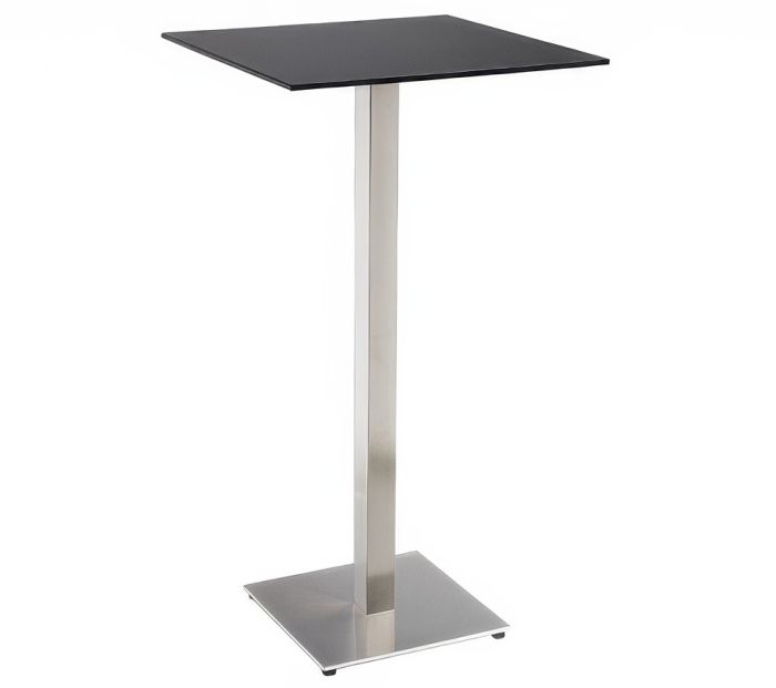Smart bistro table with square base in satin stainless steel, white or black painted. Top available in melamine, HPL or glass, round or square.