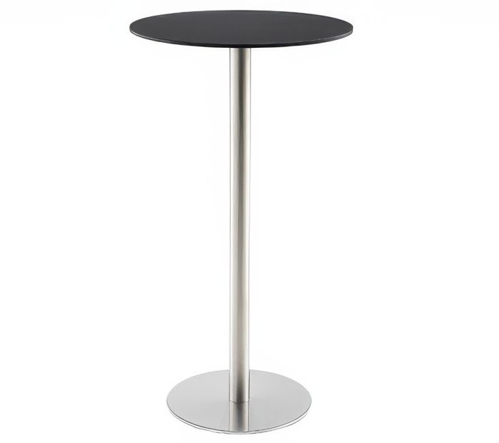 Sleek bistro table featuring a square base in satin stainless steel, available in white or black finish. The tabletop comes in melamine, HPL, or glass, with options for both round and square shapes. The version with an HPL top is suitable for outdoor use.