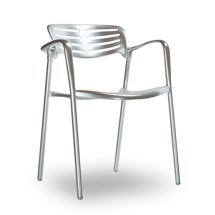 Armchair suitable for both indoor and outdoor settings, featuring a seat and back constructed from anodized and polished aluminum, assembled with stainless steel screws. This chair is stackable and 100% recyclable, complying with international standards for low-emission products.