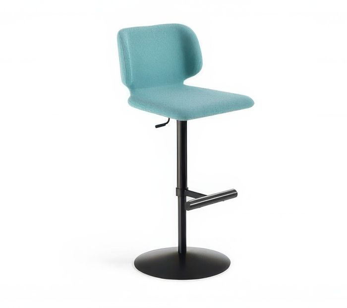 Height-adjustable Wrap stool with a swivel metal base and seat upholstered in fabric, leather, or faux leather. Upholstery options include two-tone or dual-material designs for the front and back.